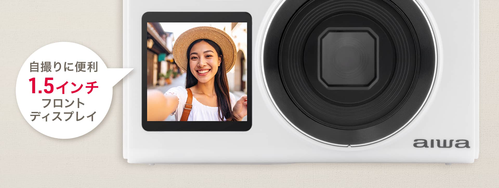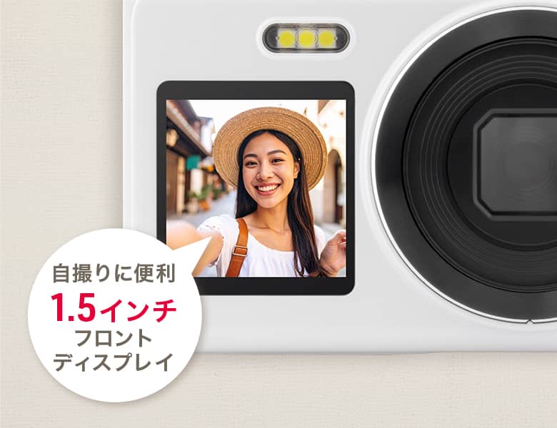 1.5インチのフロントディスプレイで、自撮りの構図を確認しながら思い通りの一枚をスムーズに撮影できます。