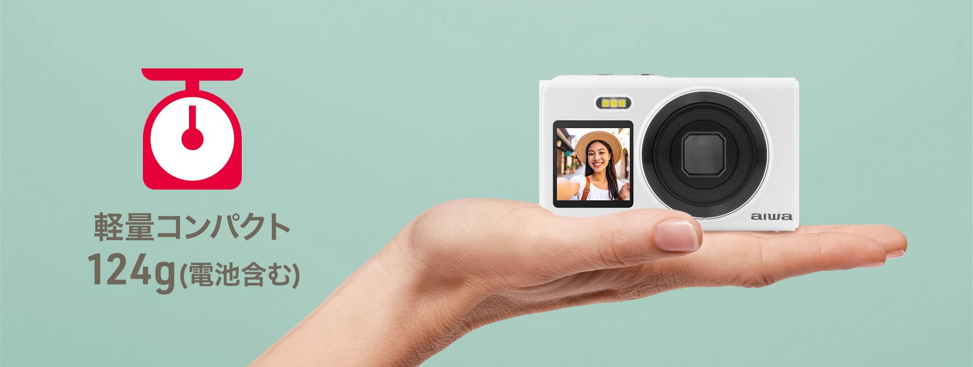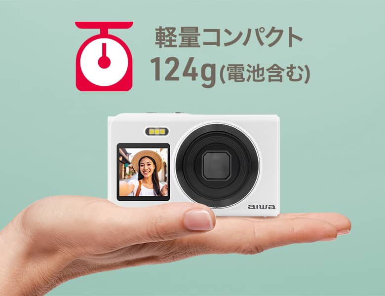 わずか124g※と軽量で、手のひらにおさまるコンパクトサイズ。ジャケットやバッグのポケットにも無理なく入ります。
