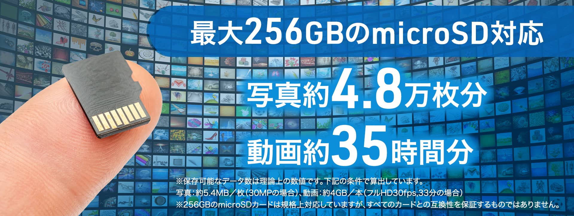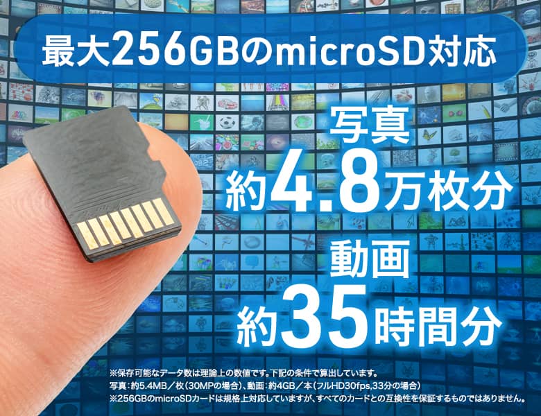 microSDは最大256GBまで対応しているため、撮影した写真や動画をたっぷり保存できます。